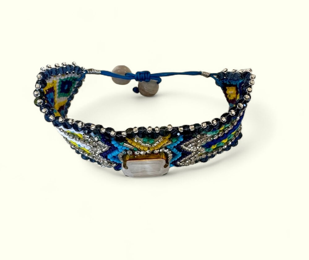 A bold statement piece handcrafted in Mexico, combining colorful woven threads with sparkling bead accents and a central gemstone. Each bracelet is unique, showcasing vibrant patterns and meticulous artisanal work. Adjustable closure for a comfortable fit.