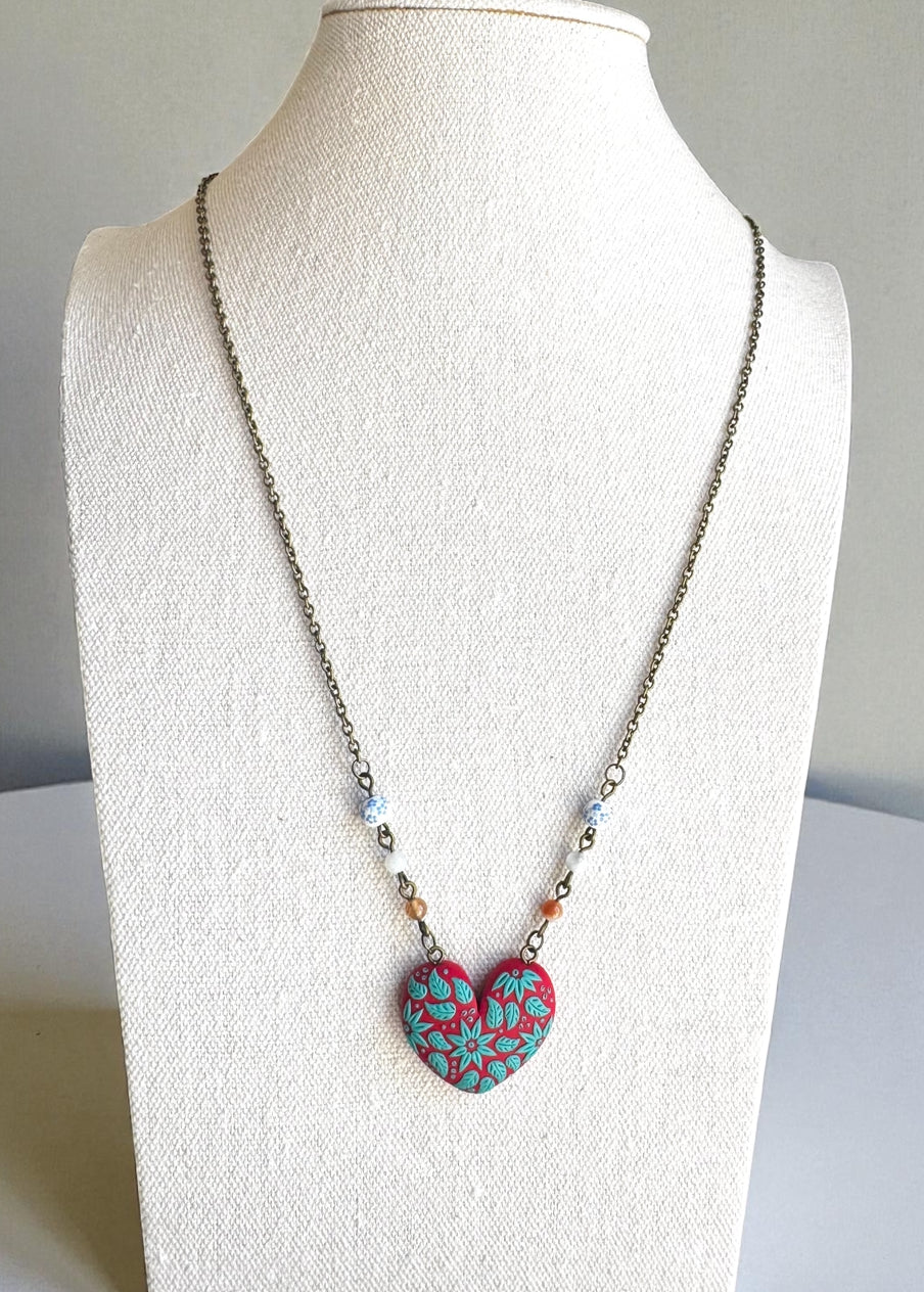 Colorful polymer clay heart necklace with hand-detailed flowers. A charming, lightweight statement piece full of vibrant personality.