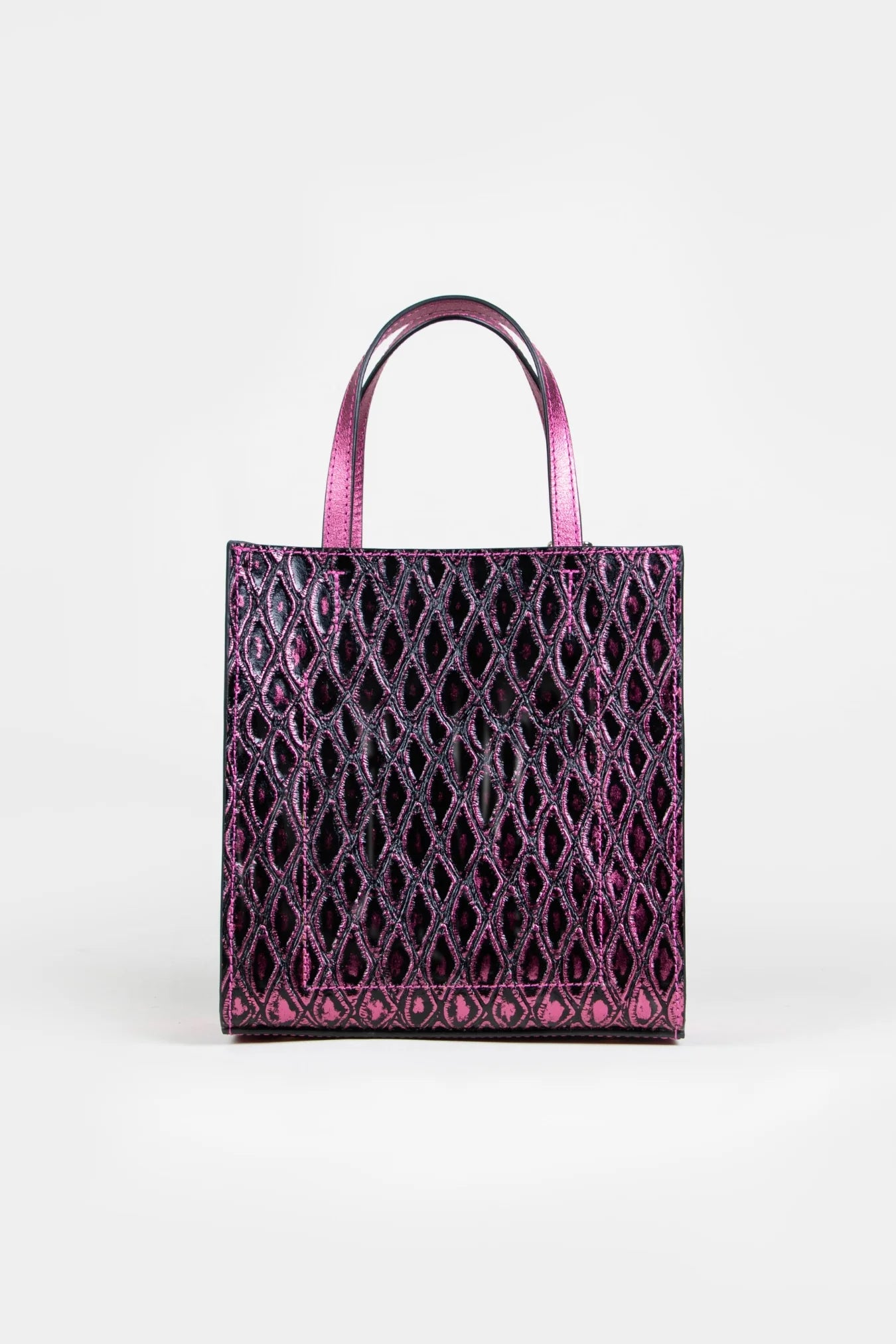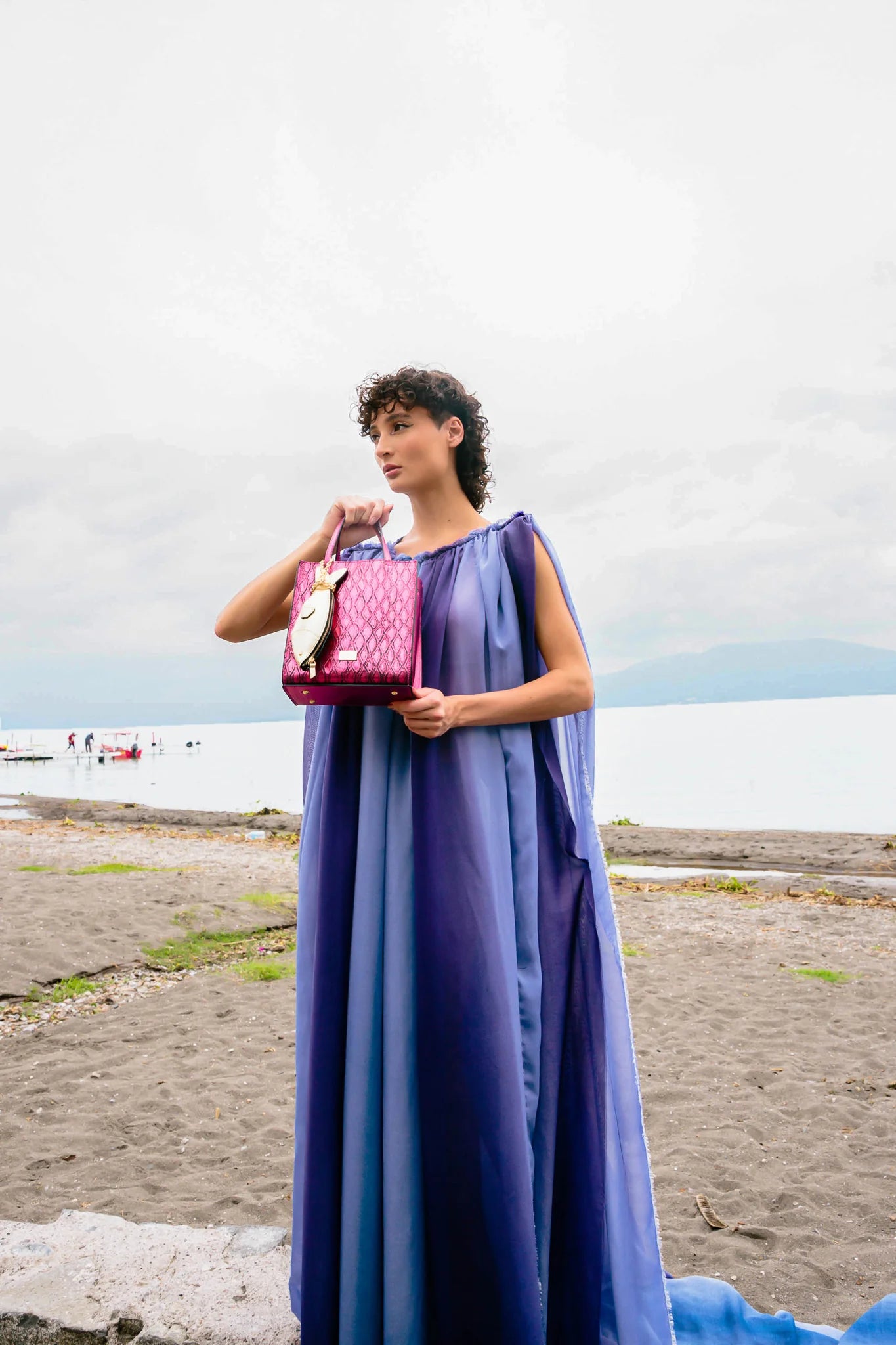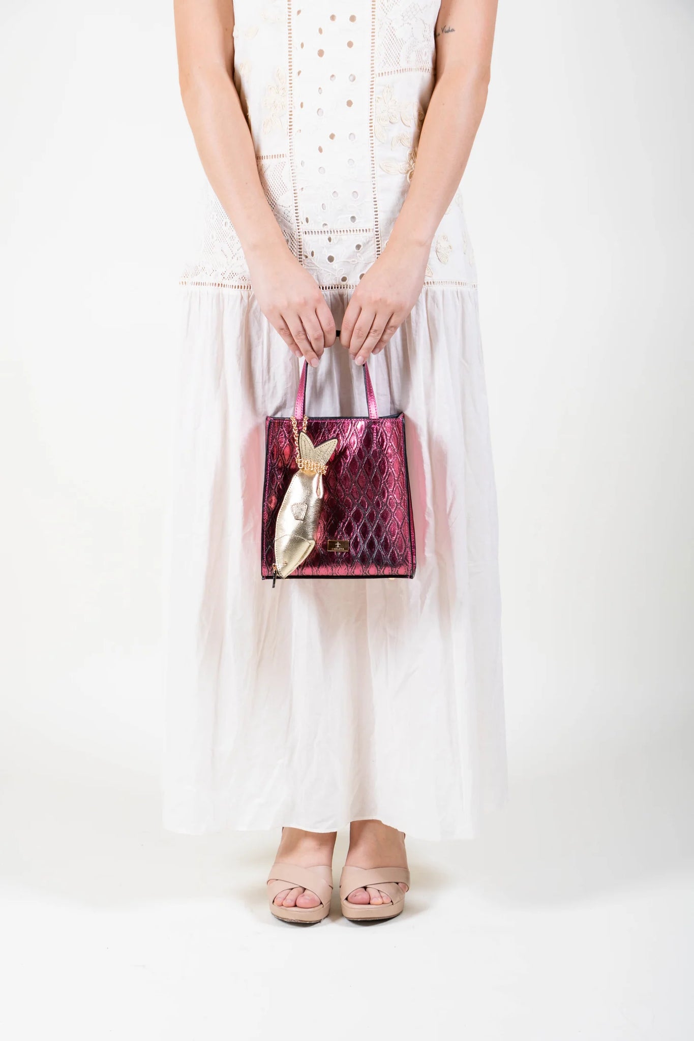 The Baby Tote Bag features a fish-scale embossed texture and two versatile ways to wear it. It includes a charming fish charm that doubles as a mini pouch.